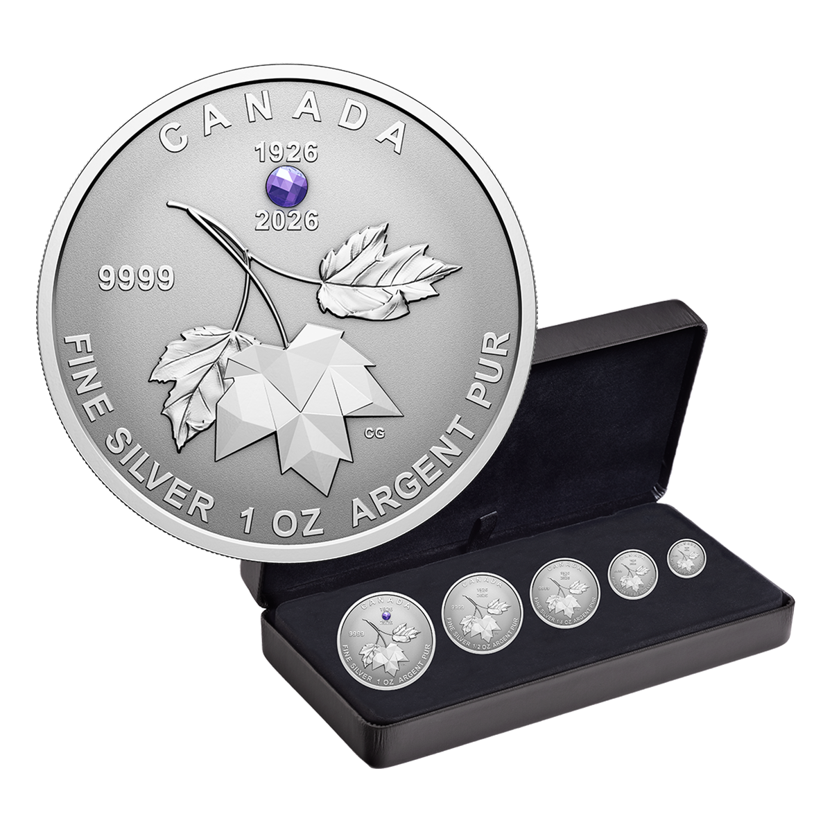 Tutte e cinque le monete sono in argento puro al 99,99% con finitura proof sul retro. Disponibilità limitata. Solo 3.500 set sono disponibili in tutto il mondo. Le cinque monete sono incapsulate singolarmente e presentate insieme in una custodia nera a conchiglia con il marchio della Royal Canadian Mint, corredata da una scatola di cortesia nera.
